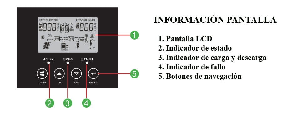 La pantalla LCD tiene una resolución de 255 x 160 píxeles con retroiluminación facilitando su lectura. Los datos de generación energética, alertas y otra información se muestran al usuario de forma clara y sencilla. El Inversor Cargador 1000W 12V Must Solar es un sistema todo-en-uno que no necesita ningún aparato más.