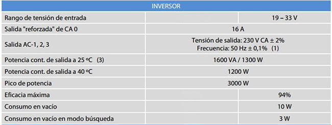La parte inversor tiene una potencia de 1600VA con conexión a baterías de 24V. La onda que genera el inversor es de onda senoidal pura, lo que permite un correcto funcionamiento de todos los equipos de una vivienda tales como televisores, luces, lavadoras, etc.. El inversor emite corriente senoidal pura 230V monofásica a través de una bobina de cobre, lo que garantiza una mayor duración del aparato, dado que la manera de emitir la corriente es mecánica, lo que minimiza fallos de componentes eléctricos.