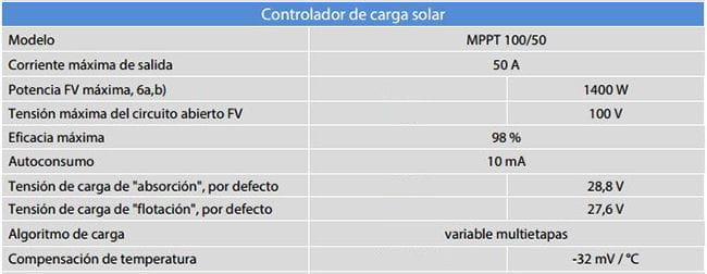 La parte del regulador de carga, lleva dentro incorporado un regulador MPPT de 100V máximo de tensión y 50A máximo de corriente, permitiendo así, aprovechar hasta 1400W de paneles solares, por lo que podemos instalar unos 4 paneles de 320W, que son actualmente los más potentes de la gama de 24V. También podemos instalar paneles de conexión a red, de por ejemplo 270W, que aunque el inversor sea a 24V, el regulador de carga MPPT nos ajustará el voltaje a 24V. Si ponemos paneles solares de 270W debemos poner una cantidad par y aprovecharemos el máximo si instalamos 6 paneles solares.